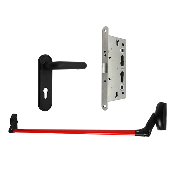 Принцип работы комплекта следующий: с внутренней стороны двери язычок врезного замка всегда открывается простым нажатием на горизонтальную штангу-ручку, обеспечивая быстрый выход. Снаружи управляется сердечником и нажимной ручкой. Сердцевина докупается отдельно.