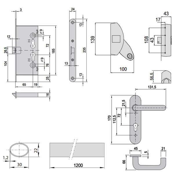 Корпус антипаники выполнен из приятного на ощупь алюминия. Все внутренние элементы механизма, врезного замка и ручки изготовлены из оцинкованной стали, поэтому комплект подходит для использования в противопожарных дверях. Также торцевая планка врезного замка из нержавеющей стали.