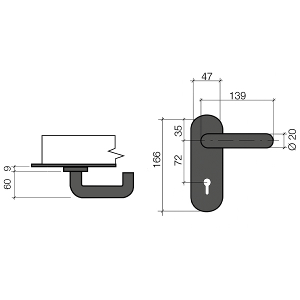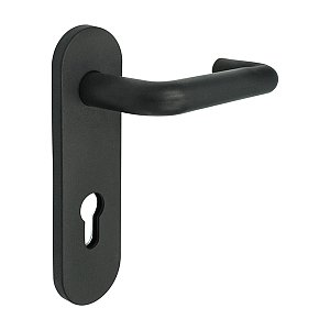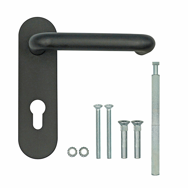 Важным элементом функционирования является раздельный шток. В данной модели он имеет увеличенные размеры 55х55 мм. Внутренняя плата изготовлена из стали, наружная пластина и ручка из качественного пластика. Межосевое расстояние составляет 72 мм. В трендовом черном матовом цвете будут прекрасно подходить к двери темного оттенка или как акцентный элемент фурнитуры к светлым полотен.