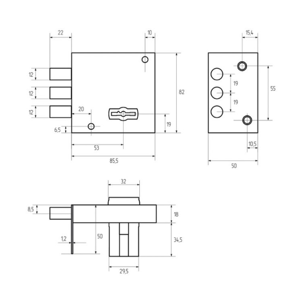 Данная модель универсальна – предназначена для дверей как левого, так и правого открывания. управляется сувальдным ключом. Он приводит в действие 3 круглых стальных ригеля диаметром 12 мм. Полный их выход составляет 22 мм.