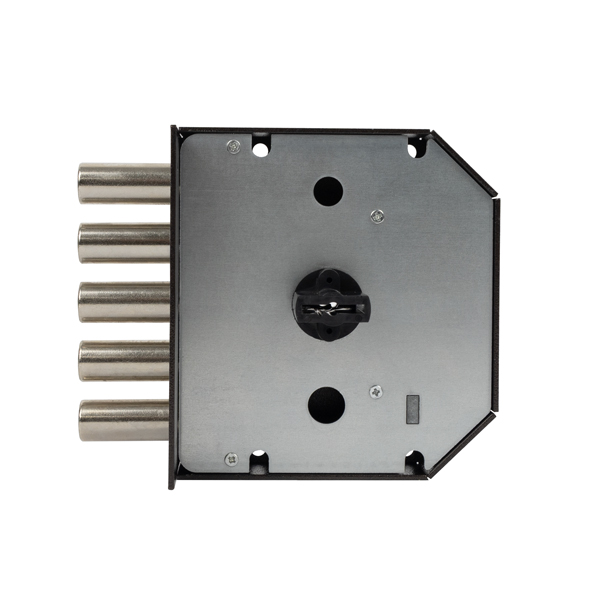 Данная модель универсальная – предназначена для дверей как левого, так и правого открывания. Управление происходит сувальдным ключом. Он приводит в действие 5 круглых стальных ригеля диаметром 18 мм. Полный их выход составляет 40 мм.