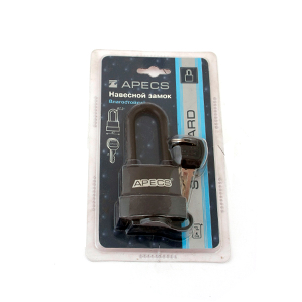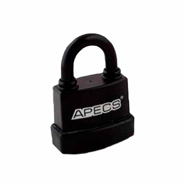 APECS PDR-50 - навесной замок китайского производства. Чугунный корпус в пластиковом чехле защищает от коррозии, влаги и различных погодных условий. Дужка запирается с двух сторон, что повышает защиту от силового взлома. Вокруг дужки также находятся резиновые кольца, которые препятствуют попаданию влаги в замок. У этой модели есть резиновая заглушка, которая не дает попасть пыли и грязи в сердцевину замка. Имеет функция автоматического запирания, в результате нажатия на дужку. Такой замок уверенно можно использовать и в помещении, и на улице.
