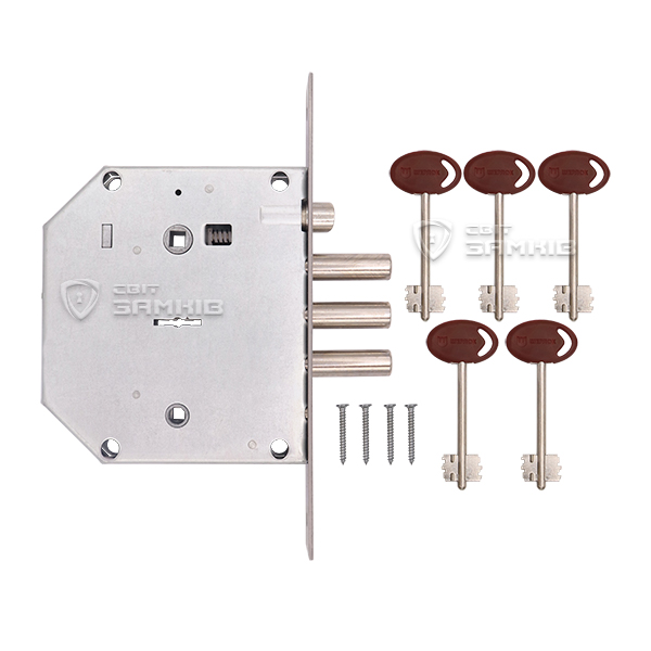 Подходит для правой и левой двери так как язычок реверсивный. После полного проворачивания ключа замыкания происходит тремя ригелями диаметром 14 мм с полным выходом 40 мм. Дополнительно с внутренней стороны замок может быть закрыт как на ночную защелку, так и ключ. Ее выход составляет 22 м. В комплекте 5 ключей.