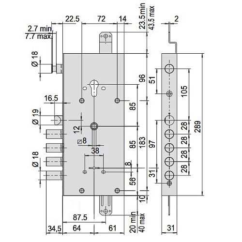 • Додатковий сталевий ригель, вихід – 22,5 мм.