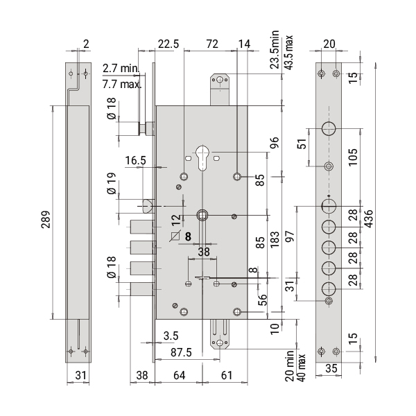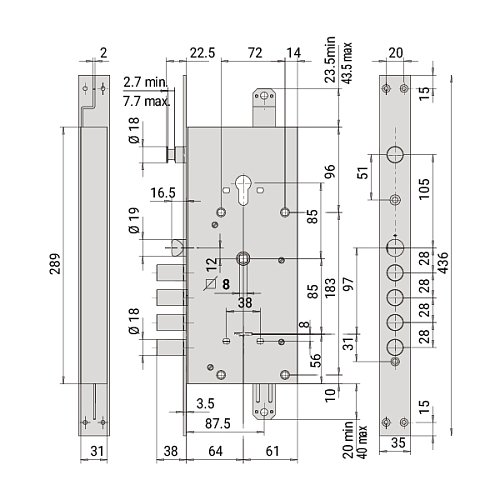 • Дополнительный стальной ригель, выход – 22,5 мм.