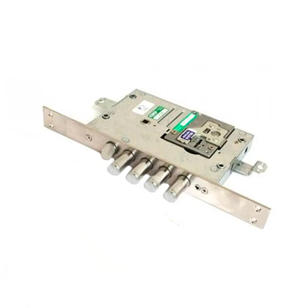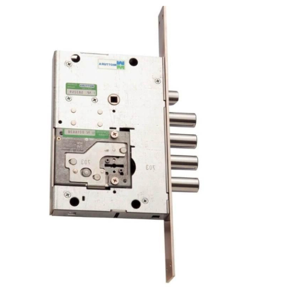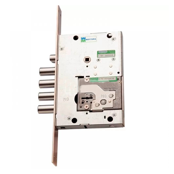 Массивный замок для входных металлических дверей ТМ MOTTURA модель 54.797 - это 4-х ригельный замок с язычком и вспомогательным ригелем под цилиндр. В корпусе объединены две системы запирания: сувальдный и цилиндровый. Сувальдный механизм состоит из 6 сувальдных пластин, среди которых есть некоторые, не имеющие пружин, а также сам блок сувальд расположен ближе к внутренней части замка. Это затрудняет открывание отмычками. При закрывании на цилиндровый замок, отверстие под сувальдный ключ перекрывается специальной пластиной, препятствуя преступному открыванию замка. Механизм предполагает установку ручки на планке с межосевым расстоянием 85 мм, или ручки на разделительной розетте.