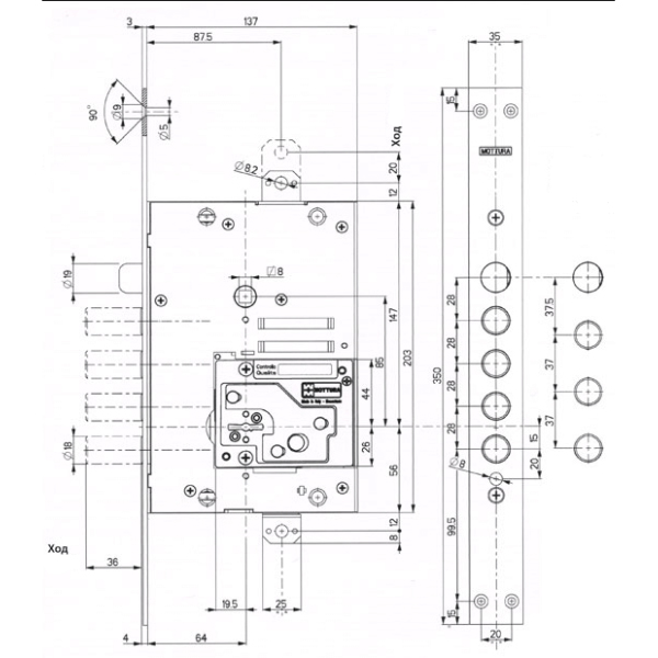Описание Механизм замка MOTTURA 52.Y535BDRN54 (BS67*85мм) R правый