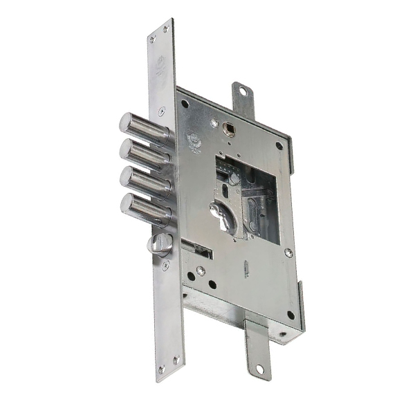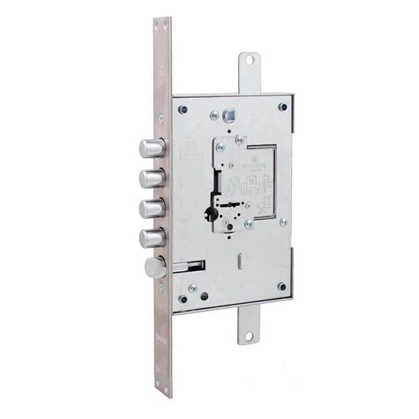 Уникальный механизм врезного замка SECUREMME 2503 это 4-х ригельный основной сувальдный замок с защелкой, который управляется ручкой и предназначен для установки в правосторонние входные металлические двери. Уникальность данного замка заключается в возможности замены сувальдный части механизма на цилиндрическую (нуклео). Таким образом, в случае потери ключа или при желании использования сердцевины вместо сувальдного механизма не нужно будет менять весь замок. Также специалисты ценят данный замок за защиту от отмычек и высверливания.