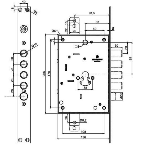 Врезной замок итальянского производства SECUREMME 2603 представляет собой цилиндрический механизм, который устанавливают в входные дверные полотна из металла. Является основным замком, имеет защелку. Сердцевина стандарта EURO DIN выбирается отдельно в зависимости от потребностей защиты и толщины двери. Замок имеет специальное запатентованное крепление сердцевины, которое защищает ее от выбивания. Данный замок предназначен для установки в правосторонние двери загородных домов, квартир и коммерческих помещений.