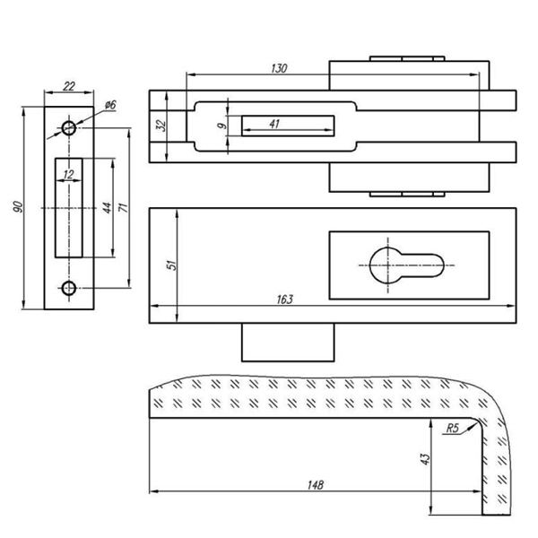 Монтаж данного замка производится методом врезки в стекло или пол. Замок работает в паре с обратной планкой и другими замками, если это необходимо. Обратная планка монтируется также врезным методом.